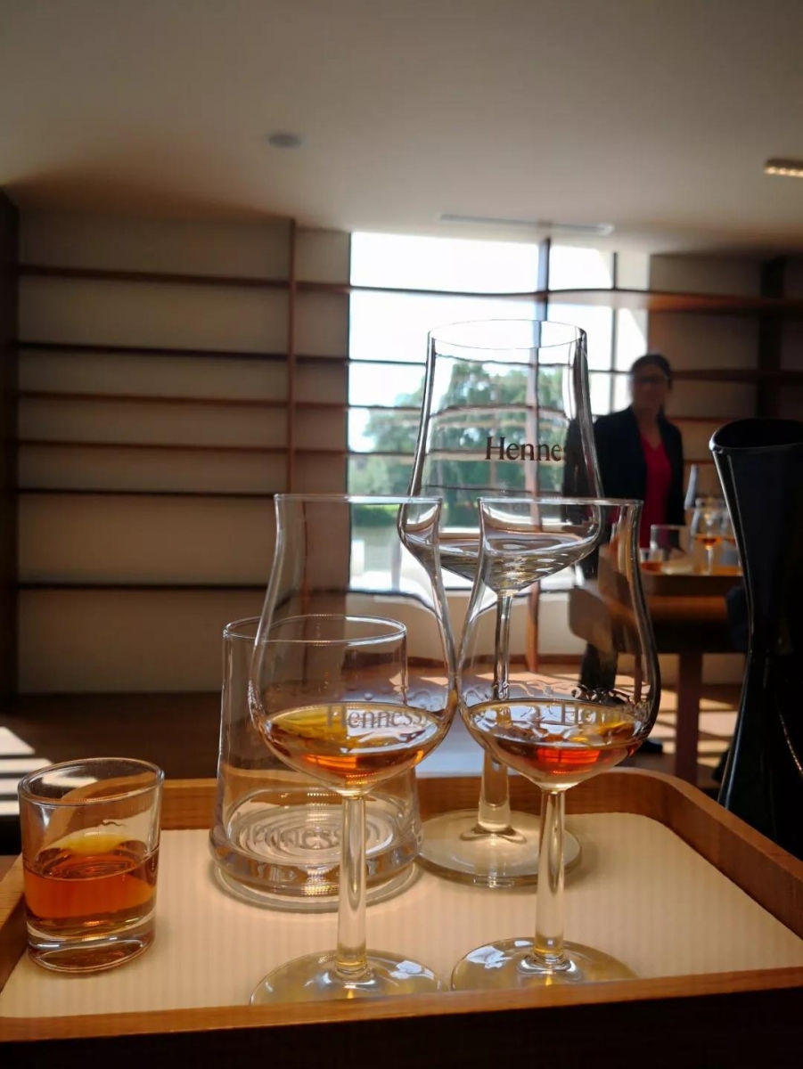 品鉴是参观干邑酒厂的重要环节。相比于葡萄酒庄品鉴,干邑品鉴相当成体系,不仅拥有专业的品鉴师带领品鉴,还会给到不同的杯型用来品鉴不同级别的干邑。