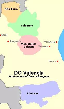瓦伦西亚产区位于瓦伦西亚省境内,包括了66个自治市政区,并划分了4个不同的子产区。