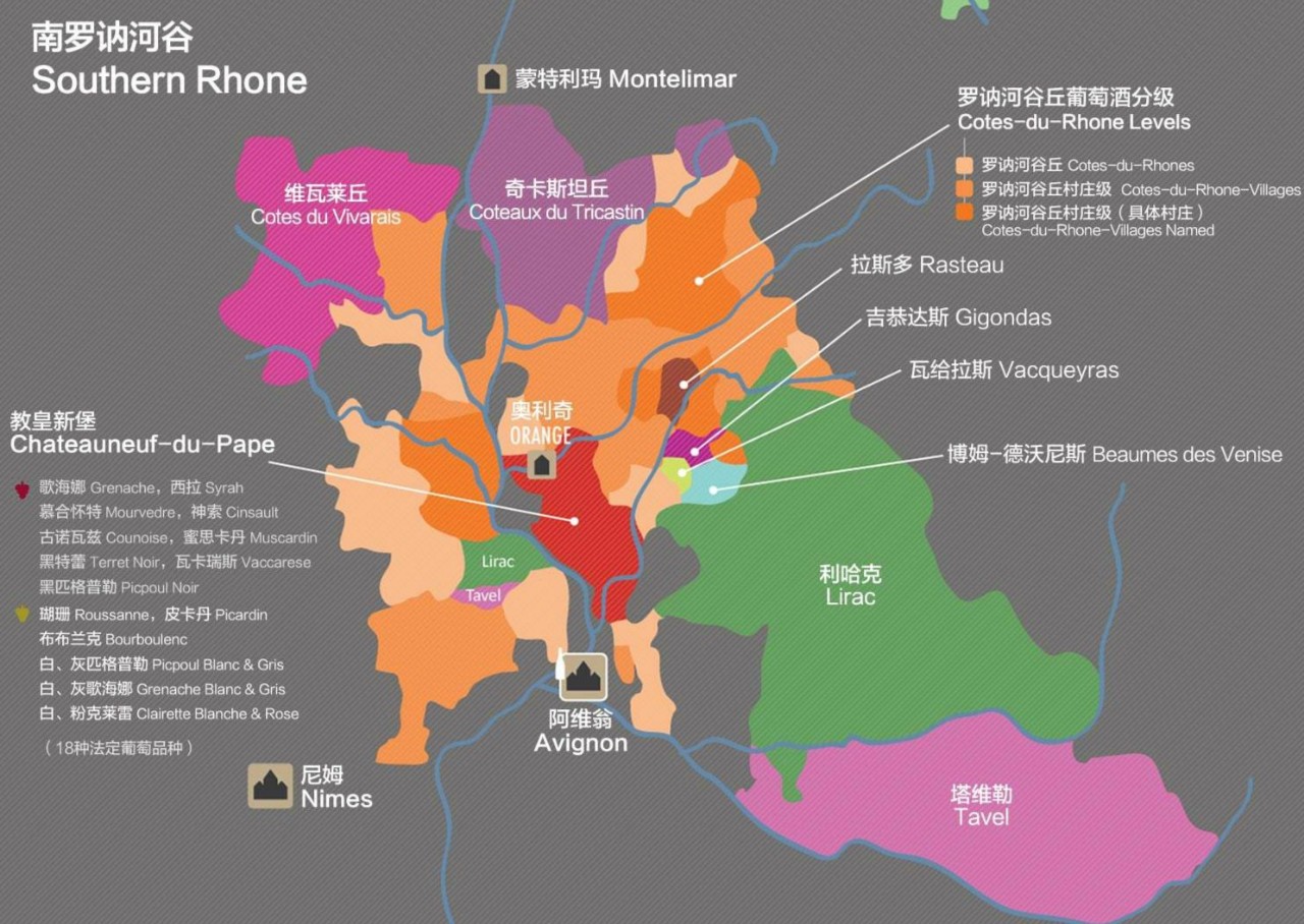 南罗纳河谷拥有品种、风格各异的9大产区,分别是:教皇新堡Chateauneuf du Pape、