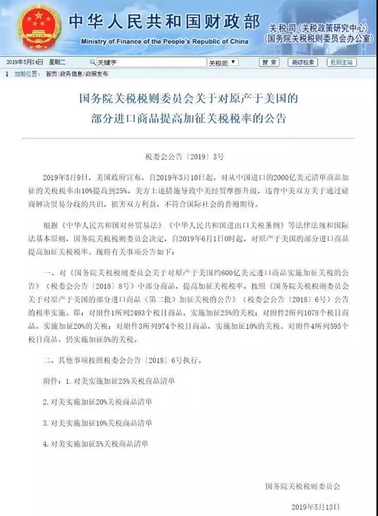 院关税税则委员会发表公告,自2019年6月1日0时起,对已经实施加征关税的600亿美元