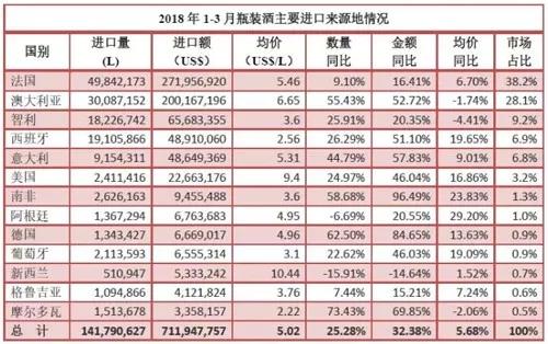 截止2018年初,美国在中国进口葡萄酒总量排行第六,仅次于法国、澳大利亚、智利、