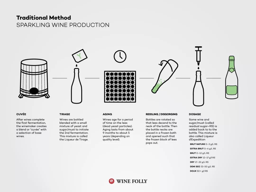 基酒酿造、瓶内二次发酵形成气泡、酵母自溶以释放烤面包香气、转瓶将酒泥沉淀聚