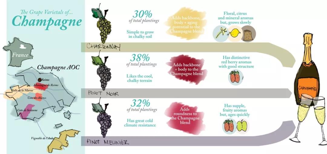 实际上另外4种葡萄也是可以酿造香槟的:白皮诺Pinot Blanc、灰皮诺Pinot Gris、阿尔