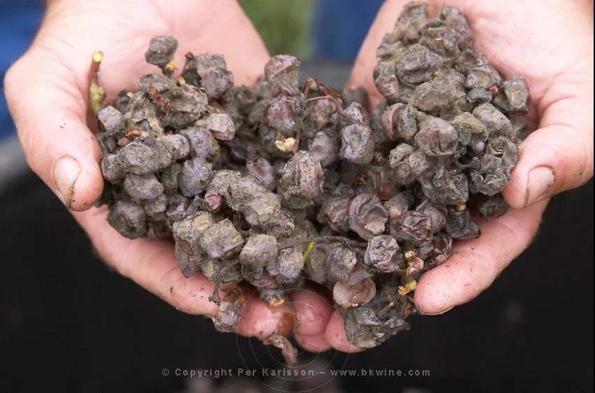 这些葡萄感染贵腐菌的过程通常会持续5-10天,葡萄中的水分因减少了一半以上而变得干缩,